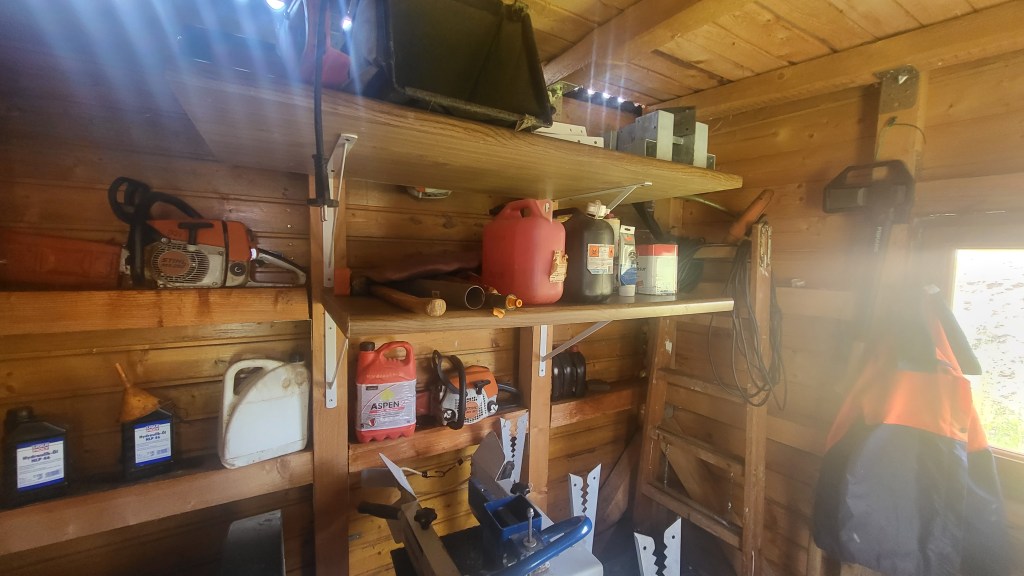 Höhe und Position wurden den Gegebenheiten und den Stellplätzen der bereits vorhandenen Geräte angepasst. Werkzeuge: 12V Akkuschrauber, Wasserwaage, Bleistift, Körner. Die Regalträger sollen um die 125 kg Je Träger aushalten. Gibt eine gewisse Sicherheit im obersten Regal, da sind die Kettensägen usw. in Parkposition.