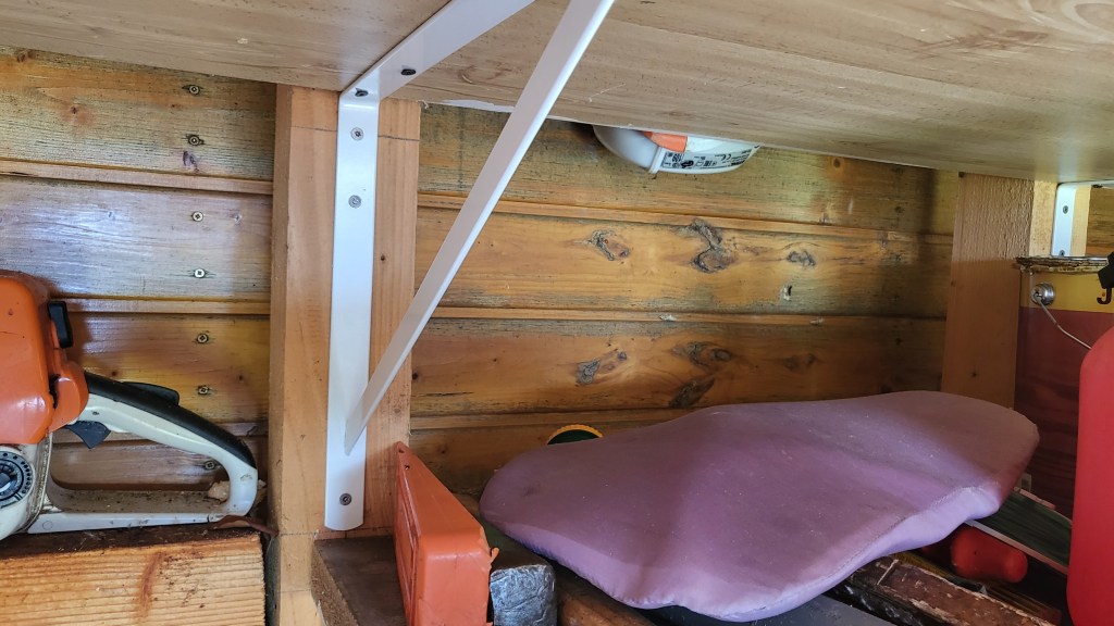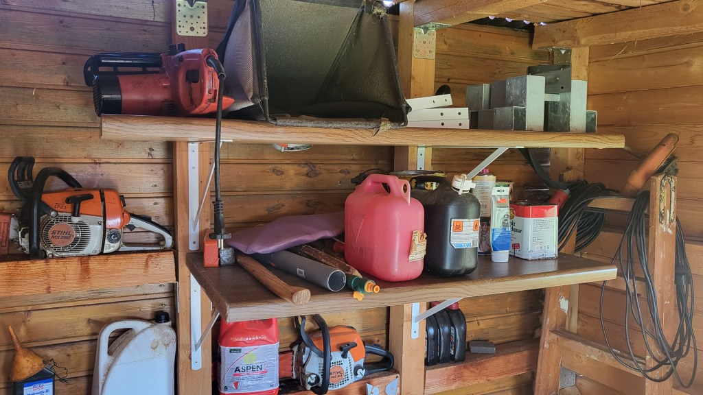 Regal aus Küchenarbeitsplatten im Geräteschuppen angebracht.
