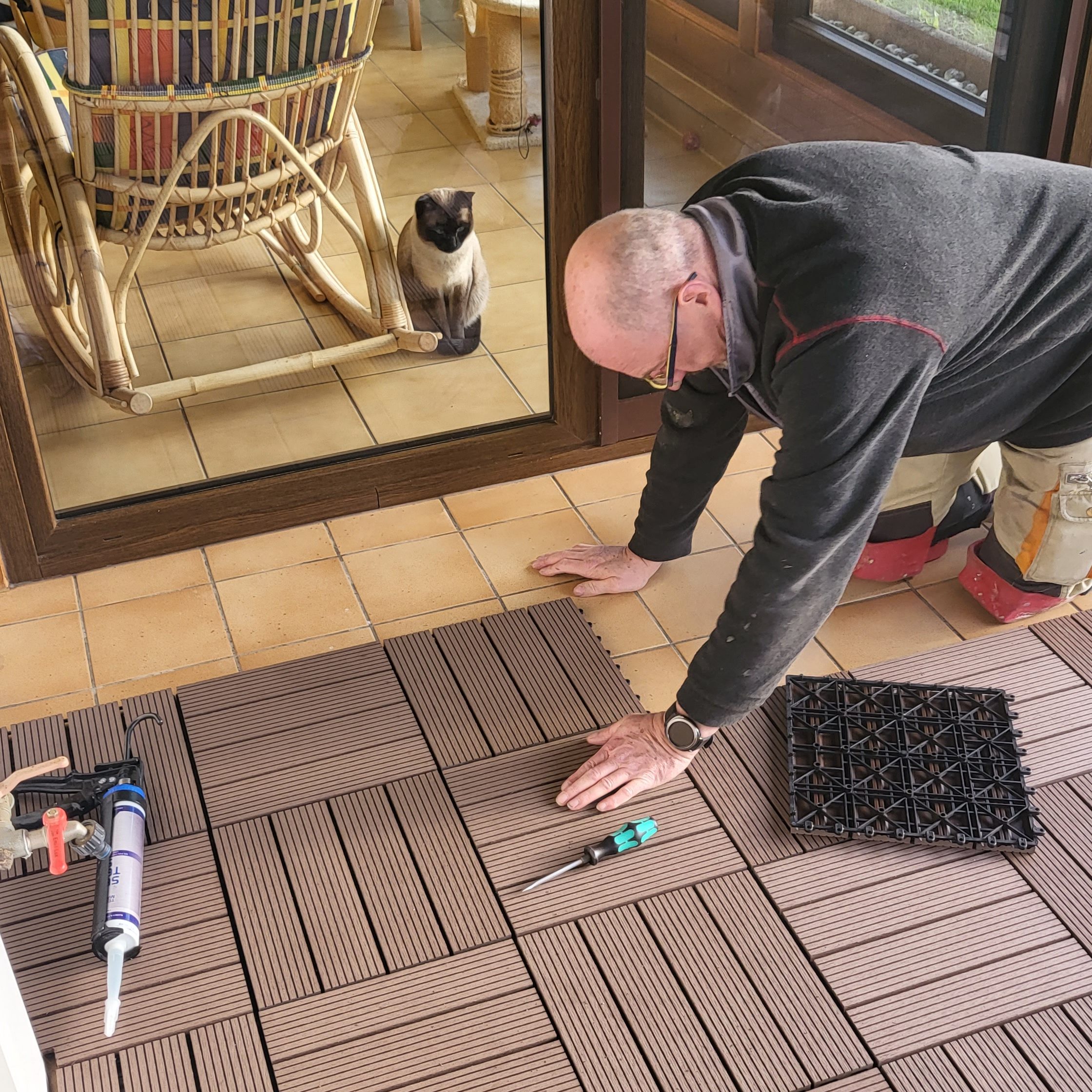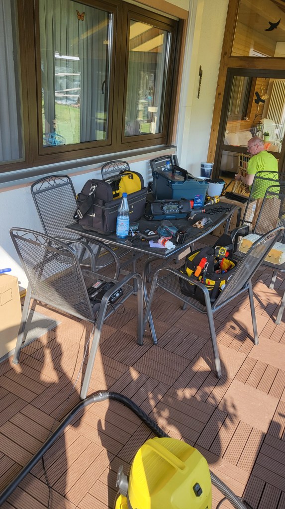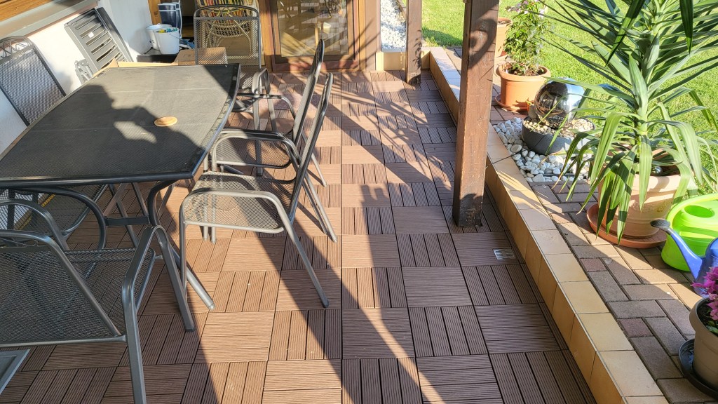 Auf mehrfachen Wunsch einer einzelnen Schwiegermutter, wurde die Terrasse mit neuen Klick-Kunststofffliesen aufgewertet.