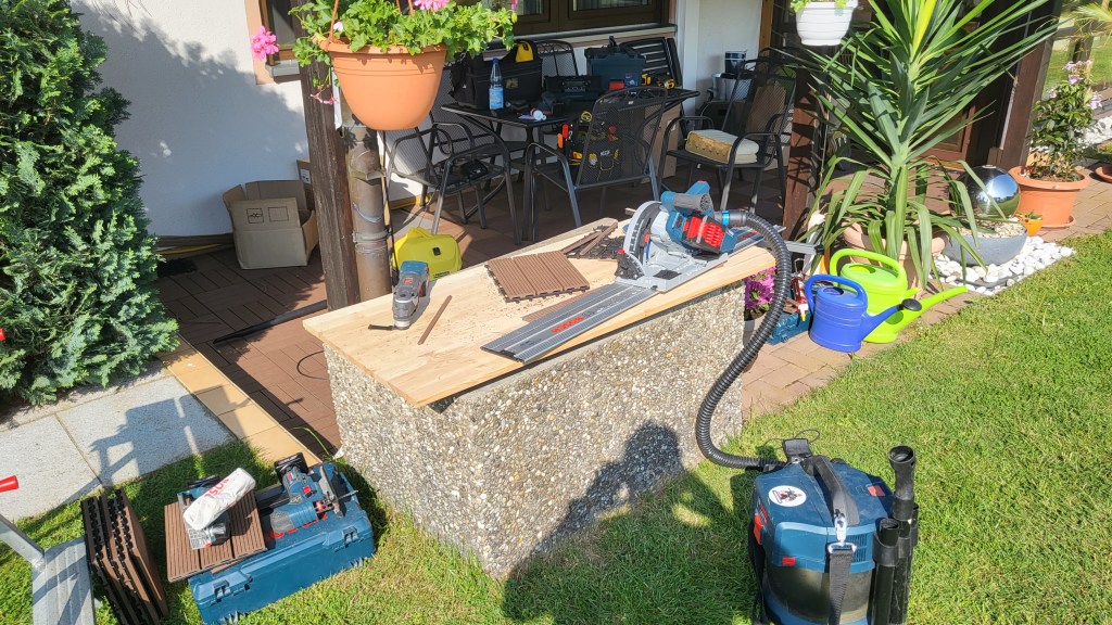 Der Zuschnitt erfolgte auf einem Wasserbecken mittels Opferplatte, Führungsschiene und Tauchkreissäge. Zusätzlich waren noch Stichsäge, Akkuschrauber, Elektrohobel, Exzenterschleifer und Oszillierende Säge im Einsatz. Eine detaillierte Werkzeugliste werde ich noch erstellen.