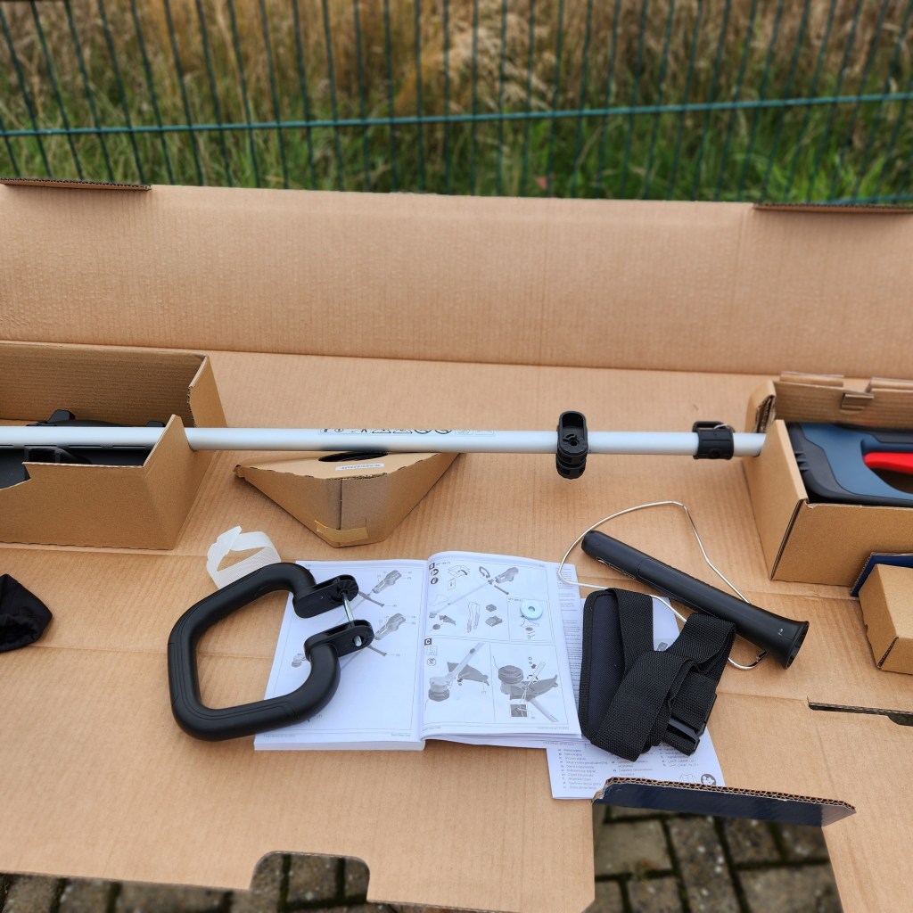 Aus dem Karton befreit, fällt die Montage des Handgriffes und der Schutzhaube am Schneidwerk ohne große Handwerkliches können sehr leicht und ist in wenigen Minuten erledigt. Der Trageriemen wird in der dafür vorgesehenen Öhse eingeklinkt, ein vollgeladener Akku eingesetzt und schon kann‘s losgehen, theoretisch.